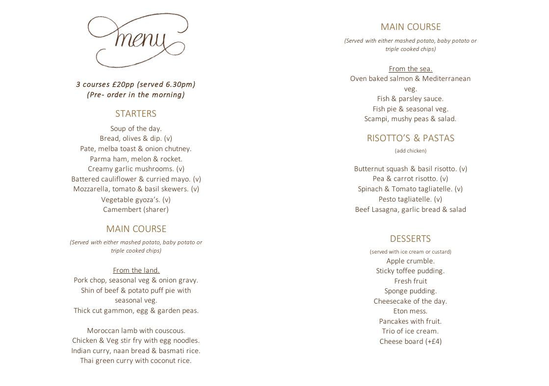 We offer a 3 course evening meal - served at 6:30pm at only £20pp